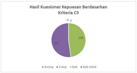 Berdasarkan Kriteria C5 yaitu kriteria sarana dan prasarana, menunjukan sebanyak 326 responden menilai bahwa pelayanan mengenai kriteria Keuangan, Sarana dan Prasarana Program Studi D4 Teknologi Listrik Industri.baik sekali dan 298 responden menilai baik.